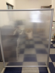 キャスター付きのパネルスクリーンは意外と便利、固定式のパーテェーションと違い気分に合わせてて移動できます。あと光の加減で透過度も変わります。